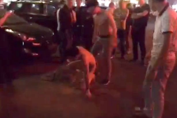 ▲一名赤身露體的「小王」蜷縮在馬路上,遭受人夫的拳打腳踢。(圖/翻攝自網路)