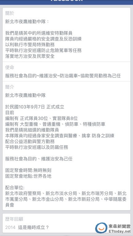 ▼由重機騎士組成的「夜鷹維勤中隊」在臉書自詡是警方的配合單位,但在今日遭淡水警分局打臉,並將追查是否涉不法。(圖/記者孫曜樟翻攝)