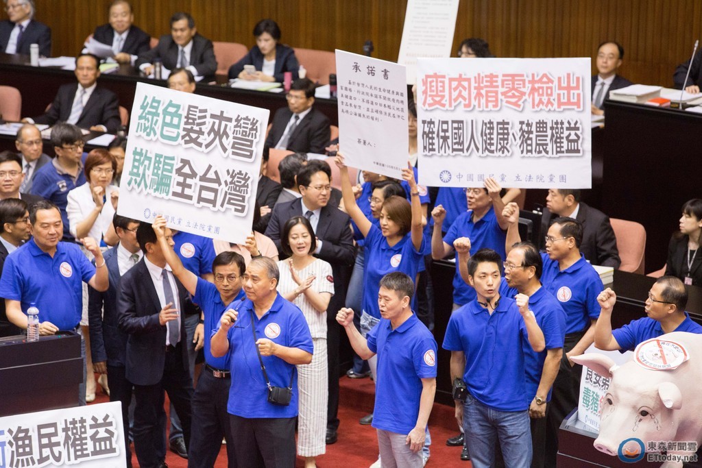 國民黨首度面臨完全在野,昨在立法院上演杯葛劇情,搬出保麗龍豬佔據發言檯,要行政院長林全承諾不進口瘦肉精美豬。國民黨主席洪秀柱1日在中常會稱讚黨籍立委「氣勢如虹,未來可期」,昨35席立委全體出席,嘉義市議會也通過自治條例,她並請在場中常委鼓掌肯定黨團。