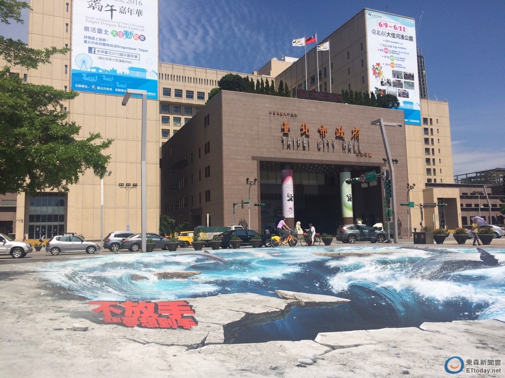 台北市府前廣場近日出現一大幅特殊的3D地景廣告,圖案是一處湍急的河谷,踩在上面就如同掉進水裡一般,相當刺激。北市觀傳局長簡余晏表示,這是黑松企業的特色廣告,並贊助世大運的企業形象,以「不放棄、不放手」為核心主軸宣傳「乘夢破浪」的世大運精神。