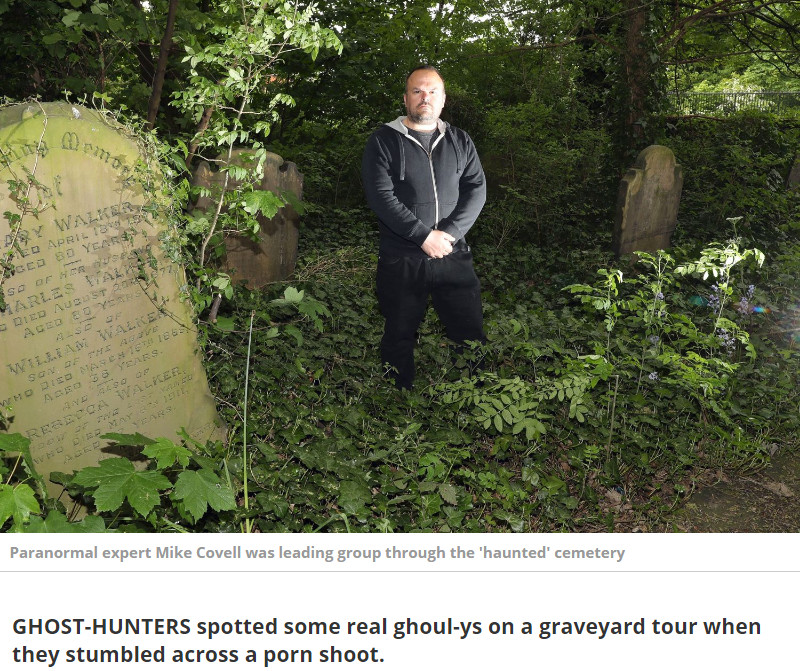 英國頗富知名度的靈學專家柯威爾(Mike Covell)上個月帶領一群民眾,前往一處約有200年歷史的廢棄墓園探險,突然間有人聽到呻吟聲,不久就看到一對男女正在一處爬滿長春藤的墓碑上做愛,而旁邊還有2名男子手持麥克風與攝影機,這時這組探險隊才意會到,他們意外撞見一個詭異的成人片拍攝現場。
