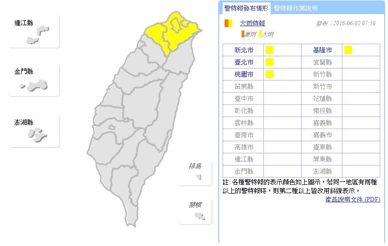 氣象局2日上午7時50分發布大雨特報,受到鋒面影響,易有短時強降雨,基隆北海岸、新北市、臺北市及桃園市有局部大雨發生的機率,請注意瞬間大雨、雷擊及強陣風。