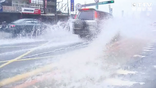 受到鋒面影響,氣象局今天(2日)一早就針對新北市、台北市、基隆市、桃園市發布豪雨特報,而早上淡水老街就因為大雨積水,人車都受阻,而淡水馬偕醫院前也同樣出現淹水狀況,車輛經過時都濺起大量水花,目前雨勢還是不小。