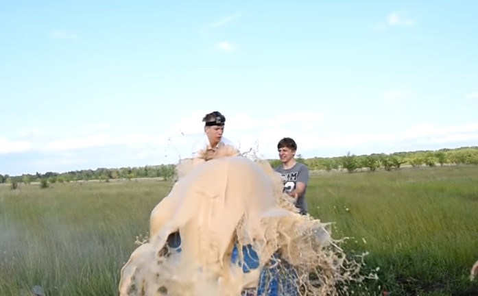當曼陀珠碰上可樂會造成猛烈噴發,先前就有民眾全身黏滿曼陀珠泡可樂澡、或同時放進嘴裡引爆等,惡搞人體極限。但這群俄國青年行徑更狂!把實驗場景拉到戶外草地,準備大量的1000公升的可樂,倒入藍色大桶子再加入曼陀珠,嘩的一聲!只見影片中的主角馬上被炸飛。