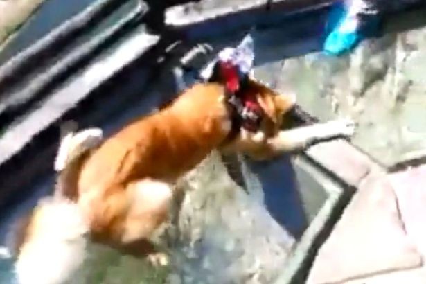 ▲影片顯示,可憐的狗狗牠四肢張開的趴在透明玻璃走道上被拖行,一動也不敢動。(圖/翻攝自網路)