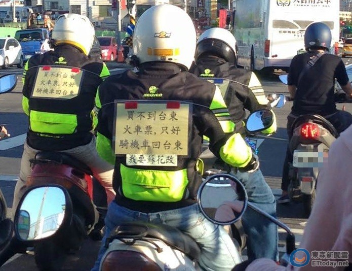 花東火車票一票難求,1日開放的實名制744張票竟半小時完售,讓許多人苦惱該怎麼回家啊,台鐵也因此加開班次、5日開放訂票。網友席恩昨日就在台南中華路上拍到,3名熱血騎士騎著小50要到台東,背上貼著「買不到火車票...我要蘇花改」。