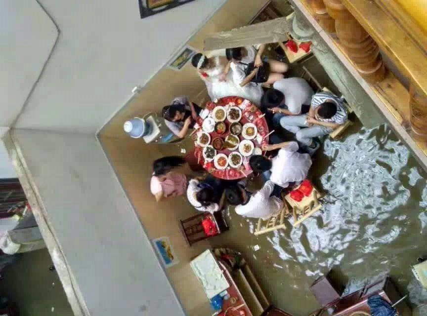 婚禮是一生中的重要大事,許多新人絞盡腦汁大玩創意,你看過什麼特別的婚禮呢?湖北一對新人2日舉辦婚禮時不巧遭遇大暴雨,道路和房屋都被洪水淹沒,成人的小腿肚都泡在水哩,但這對新人不畏任何阻礙,決定在水中辦酒席,最後一家人圍在圓桌前,翹著腳吃完了這頓飯,堪稱最難忘的水上婚禮。