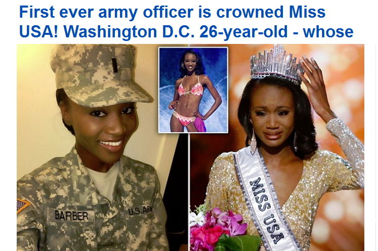 2016年「美國小姐」(Miss USA)選美上周日( 5日)在內華達州拉斯維加斯舉行。來自哥倫比亞特區的26歲女軍官芭伯(Deshauna Barber)贏得后冠,她將代表美國參加環球小姐選美。