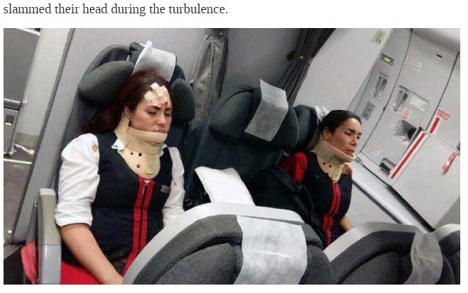 據《鏡報》報導,哥倫比亞1架班機5日飛行途中,飛經安地斯山脈上空約41000英呎處(高度約12496公尺),突然碰上強勁氣流,令所有人措手不及,空姐當時並未繫上安全帶,頭部猛烈撞出一道傷口,當場鮮血直流、染紅襯衫。