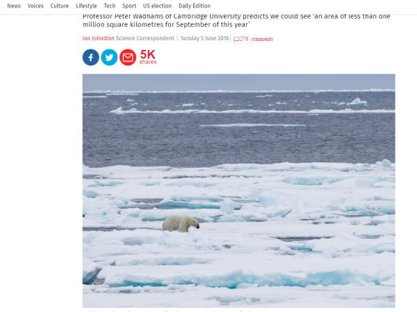 根據英國《獨立報》(The Independent)報導,目前北極冰層急遽地縮小,瓦德漢斯他根據美國「國家冰雪資料中心」(National Snow & Ice DataCentre)的衛星資料統計,今年6月1日北極冰層面積僅約1110萬平方公里,但在過去30年間,平均是1270萬平方公里,縮小了約160萬平方公里,相當於6個英國的面積。