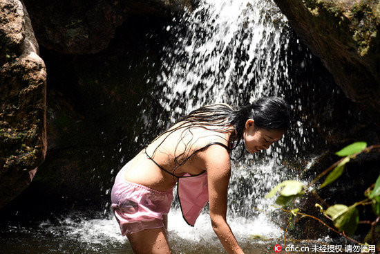 廣東連山壯瑤自治縣,幾名壯族姑娘穿著傳統的壯家肚兜,根據該族傳統的五月初五洗浴儀式,上到金子山,在瀑布下、山澗裡洗泉水澡,潑水嬉戲,通過這個傳統習俗呼籲人們愛護水環境。