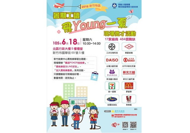 新竹市政府將於年6月18日上午10時至下午2時在新竹市北區行政大樓5樓禮堂(國華街69號),與勞動部勞動力發展署桃竹苗分署新竹就業中心共同舉辦新竹地區「暑期工讀 飛YOUNG一夏」現場徵才活動,歡迎青年朋友及求職者把握機會前往面試。
