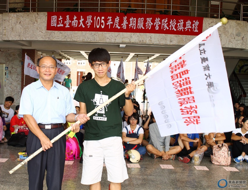 暑假即將來臨,又是國立台南大學學生走出校園展現熱情,貢獻所學服務人群的時刻,今年共有11支隊伍投入偏鄉服務、1支國際服務隊,在校園也有4支系所營隊,8日特別舉行「暑期營隊授旗儀式」,由校長黃宗顯親自授旗。