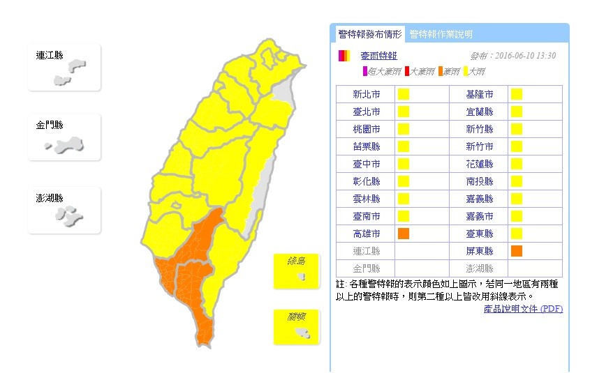今明兩天預計西南氣流威力最強的時間點, 中央氣象局在今天下午1點30分, 針對新北市、基隆市、台北市、宜蘭縣、桃園市、新竹縣、苗栗縣、新竹市、台中市、花蓮縣、彰化縣、南投縣、雲林縣、嘉義縣、台南市、嘉義市、綠島、蘭嶼等,全台17縣市發布大雨特報,高雄市和屏東縣則是豪雨特報。