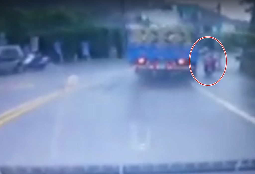 下雨騎車千萬別搶快!一名網友在臉書「爆料公社」PO出一段影片,一輛雙載機車為了要超越前方的大貨車,鑽入右線猛催油門,沒想到車沒超成功,反而進入大貨車的視線死角,在轉彎處被「貨車+路燈」夾擊,差點被輾過!