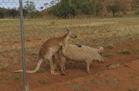 澳洲北領地(Northern Territory)一處休息站的公袋鼠跟母豬似乎墜入愛河,兩隻動物不只時常黏在一起,還不時出現類似愛撫的親密動作,公袋鼠甚至還會從後方抓住母豬的臀部交配。主人表示,牠們談戀愛已經有一年多,感情越來越好,連園區裡面其他的動物都非常好奇牠們的關係。