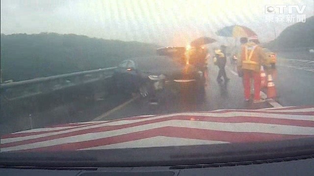 國道1號五楊高架北上五股匝道口處今天清晨6時許發生車禍,一輛媒體採訪車行經北上35.3公里處時,疑似因為下雨天打滑,導致後方一輛計程車追撞,計程車駕駛將車輛停駛內側車道,隨後下車擺放警告標誌,沒想到卻遭後方一輛轎車撞上,當場撞飛摔落至平面車道,送醫前已無呼吸心跳,目前仍在搶救中。