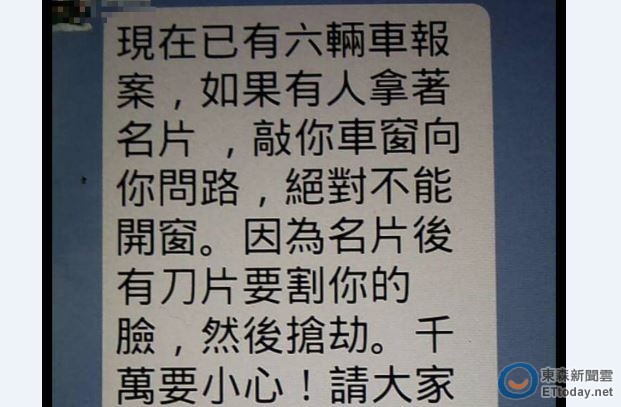 近日通訊軟體LINE 流傳這封訊息,內容是「現在已有六輛車報案,如果有人拿著名片,敲你的車窗向你問路,絕對不能開窗。因為名片後有刀片要割你的臉,然後搶劫。千萬要小心!請大家幫忙轉發一下吧!沒開車也轉,為了身邊有開車的親友們!大家開車注意!尤其台中、豐原一帶」。
