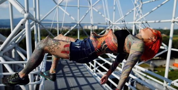 不少人常會「挑戰極限」,做出許多令人瞠目結舌的表演;但最近美國有位28歲的女子,她挑戰人體穿孔極限的「人體懸吊」(Body suspension),全身僅用10個鐵勾穿刺並懸吊在半空中,許多人看了都直呼「她不痛嗎?」都為她的「挑戰」捏了把冷汗。