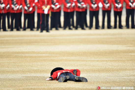 為慶祝英國女王伊莉莎白二世90大壽,今年從6月11日起,一連3天舉行多場慶祝活動。本該是全場焦點的英國王室,在今年的皇家軍隊閱兵儀式(Trooping the Colour)中,竟一度被搶走風采。有位皇家衛兵,因受不了穿著厚重制服在太陽下持續曝曬,忽然臉朝下倒地,其後也迅速被人抬出場。