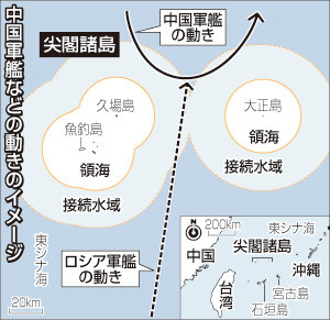 日本防衛省9日表示,在當地時間0時50分左右一艘中國海軍054型飛彈護衛艦駛入釣魚台(日本稱尖閣諸島、中國稱釣魚島)久場島附近,即日本領海外側的鄰接區,一直到凌晨3點10分才離開。同一時間也觀察到俄羅斯海軍驅逐艦等3艘軍艦駛近釣魚台附近的鄰接區,海上自衛隊便立刻出動護衛艦「瀨戶霧號」在現場監視跟蹤兩國軍艦,日本首相安倍晉三甚至因此深夜驚醒,緊急下達密切監視的指示。