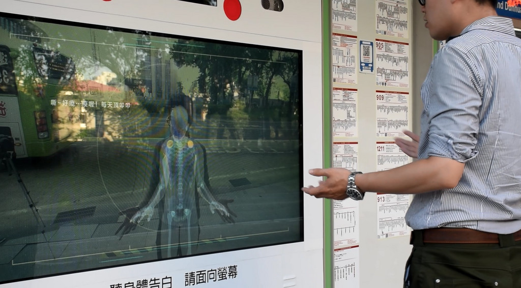「聽身體告白」數位互動牆是由長期耕耘健康科技領域的飛利浦提供,結合了人臉辨識高科技,以及視覺、嗅覺、觸覺、聽覺的4D互動情境,讓民眾等公車時不無聊,還能聆聽「自己的」身體警訊、反思生活方式是否健康,並從日常生活中針對飲食、呼吸、頭皮、牙齒及肌肉酸痛等,做到預防勝於治療。