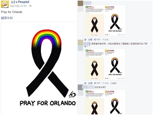 全球在象徵同志平權運動的彩虹旗下,悼念美國奧蘭多同志夜店槍擊慘案,網路上也有許多祈福圖畫力挺。人二13日晚間9時許也透過臉書粉絲團PO出一張圖畫,寫道「Pray for Orlando」,黑絲帶上交叉處塗成彩虹色,隔天竟被爆料疑似盜梗重畫。
