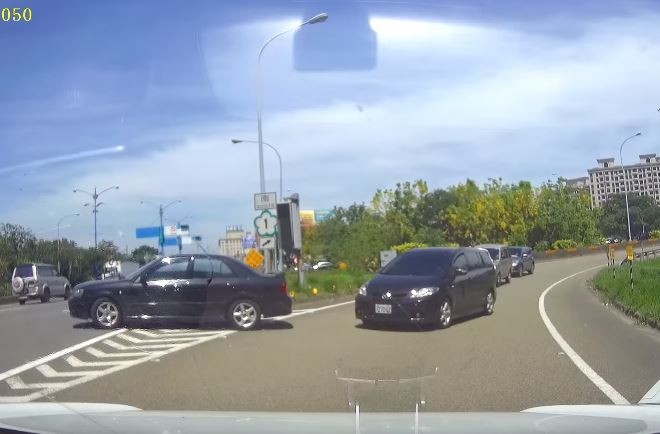 行車紀錄器影像顯示,當時白色轎車行駛在楊梅交流道上,要開往南下方向時,竟看見前方連續來了5台的逆向車,讓人不知道該如何是好。5台的逆向車一一跨越槽化線大轉彎,過程中還一點與對向來車發生擦撞,白色轎車沒辦法繼續往前行駛,只好跟著一起換方向。
