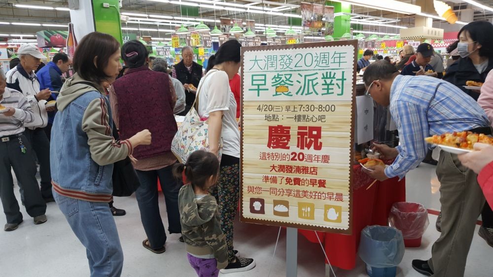 今年剛好20周年的大潤發,為了歡慶在地深根,特地聯合全台分店選在每月20號,推出豐盛早餐讓民眾免費吃。此項活動自3月起已開始舉辦,吸引大批民眾前往,據悉有人在早上7點半就排隊等開門。