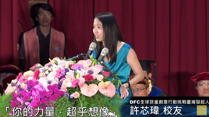 許芯瑋也藉由自己的的故事,勉勵畢業生們能夠勇於利用自己的天賦,尋找熱情,並做利他的事情,遇到困難的時候,不要忘記初衷,就可以充滿「I CAN」的力量。