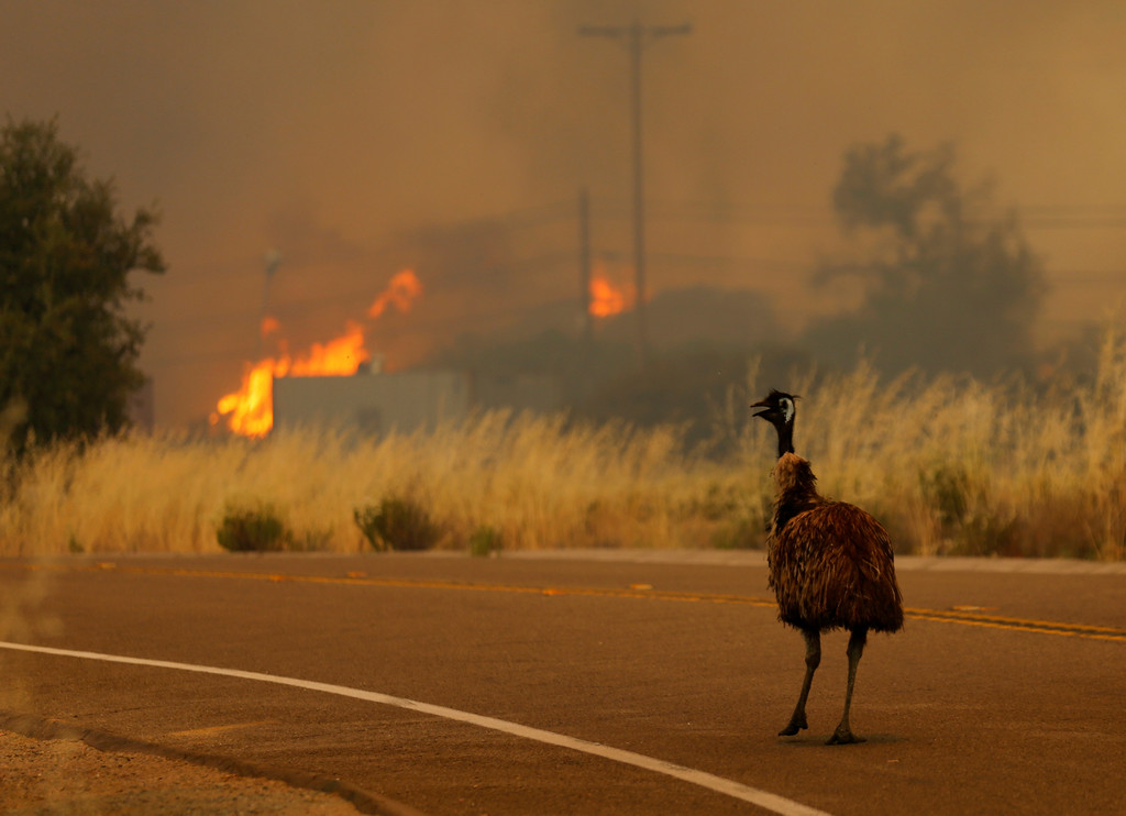 美國西部最近多個州發生山火,加州Potero附近有一隻鴯鶓(emu)看見火勢洶洶來襲,趕緊逃離火場,直到牠跑到了安全的地方,才回頭看火勢和災情如何。近日這幾場大火,以南加州、新墨西哥州災情最嚴重,美國當局動員約800名消防員及多架滅火機撲救。