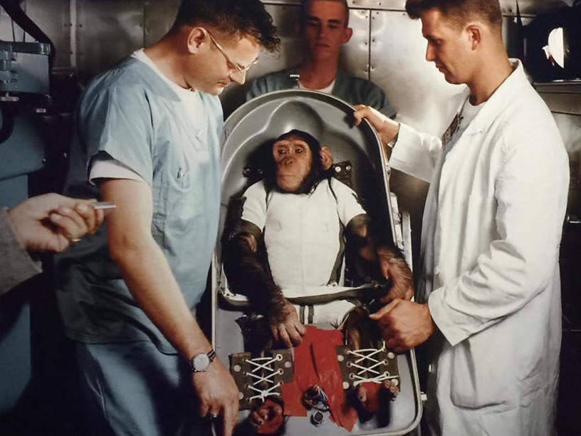 不過在以前太空科技還未盛行之前,要把人類送上太空,不免讓人覺得不安;因此在1961年NASA決定在把人送上太空之前,要讓一隻叫「Ham」黑猩猩提前試乘火箭,最後這隻猩猩也順利的從太空回到地球上,之後還成為了動物園中的人氣王。