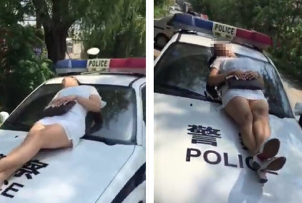 照片中可看見趙女手拿黑色包包、腳穿白色高跟涼鞋,為了防止迷你裙子太短走光,還躺出「剪刀腳」的姿勢。無論警方如何勸阻,她就是不肯下車,連路人質問:「妳跑到人家警車上坐著幹什麼?」她還直接將頭轉到另一邊,無視其他人。