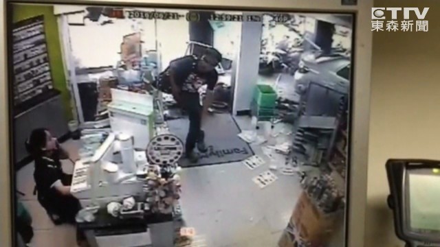 ▲超商玻璃碎一地,店內1男1女客人受波及。(圖/翻攝自爆料公社)