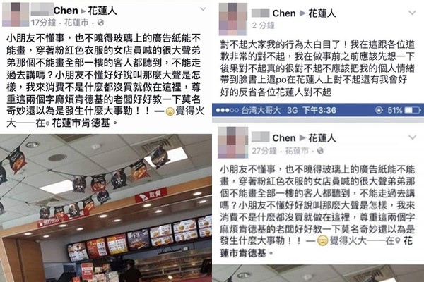 陳女PO文表示,「小朋友不懂事,也不曉得玻璃上的廣告紙不能畫,穿著粉紅色衣服的女店員喊得很大聲,『弟弟那個不能畫』,全一樓的客人都聽到了,不能走過去講嗎?小朋友不懂,好好說叫那麼大聲是怎樣?我來消費不是什麼都沒買就坐在這裡,尊重這兩個字還麻煩肯德基的老闆好好教一下,莫名其妙,還以為發生什麼大事勒!」