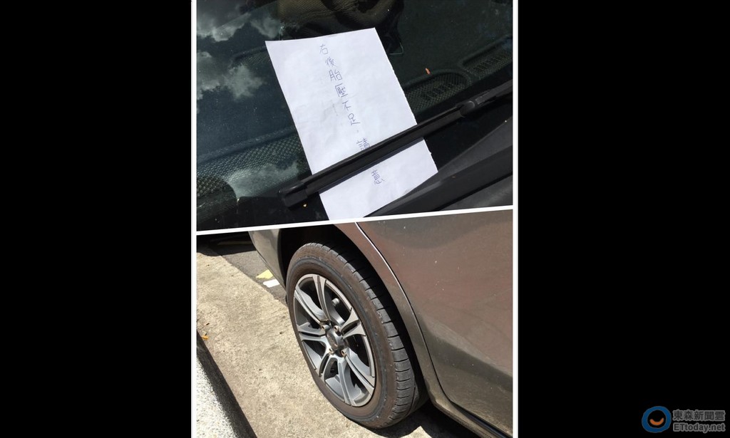 日行一善!台中網友Ryan Wu昨(22日)經過台中工業區時,赫然發現停在路旁的汽車輪胎塌陷,明顯胎壓不足,為避免車主沒注意到引起意外事故,Ryan Wu熱心的將紙條夾在雨刷上,提醒車主要注意胎壓。