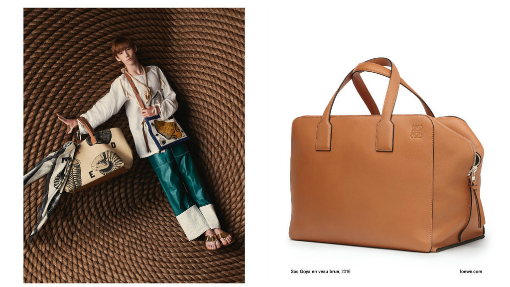 另一張廣告中的Goya周末手袋是新一季的重要配件,俐落大方的設計相當實用,7月16日起就能在特定的專賣店與官網loewe.com買到,可以迅速享受到最新包款的感覺超讚。
