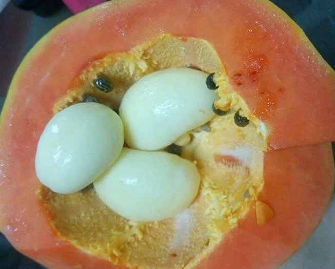 第一眼還以為是木瓜裡放水煮蛋,想惡搞出什麼暗黑料理,但這3大顆像雞南佛的白色物體,其實是罕見的胎木瓜,可能是木瓜主實體花粉受粉時,細胞分裂造成變異的不正常現象,網友們對此紛紛回應,「長知識了」、「大開眼界」。