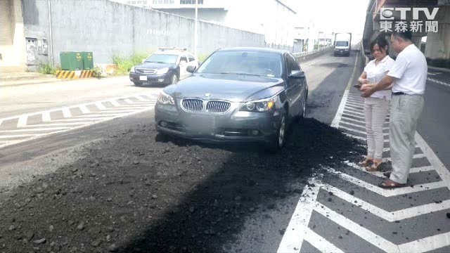一輛BMW昨天早上9點多,行經台中市西濱快速道路,在匝道口卻突然被黏在路上,原因是前方載有瀝青堆的大貨車,車上的廢爐渣掉落,一時沒注意,就秒黏住動彈不得,只好請來警方幫忙,不過卻也造成車子的水箱破裂,維修費用可能不便宜,警方目前正調閱監視器畫面,要約談貨車駕駛到案說明。