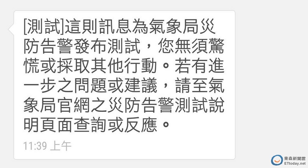 ▲氣象局災防告警系統測試簡訊。(圖/記者蕭玗欣攝)