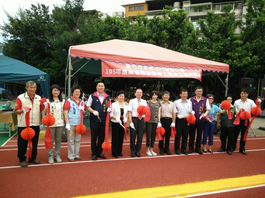 經過3個月的引頸期盼,新竹市北門國小的小朋友終於盼到嶄新亮麗的操場跑道完工!29日上午,在十鼓隊鑼鼓喧天中,歡喜舉辦操場跑道整修工程完工啟用典禮,教育處長楊傳蓮偕同議員黃美慧、陳治雄、顏政德、吳青山、蕭志潔及李姸慧,帶領市府團隊及學校同仁共同剪綵慶賀,見證操場的精彩蛻變。