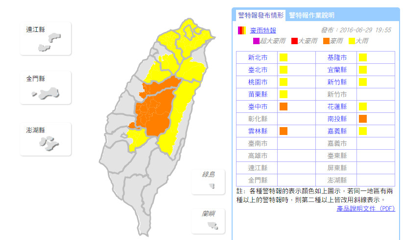 氣象局29日晚間近8時發布豪雨特報,台中、雲林、南投將出現豪雨,其他桃園以北地區、嘉義以北山區、宜蘭山區、花蓮山區也都有局部大雨發生機率,包括新北、台北、桃園、苗栗、基隆、宜蘭、新竹縣、花蓮及嘉義縣將有大雨,提醒民眾注意瞬間大雨、雷擊、強陣風及溪水暴漲。