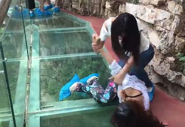 網上流傳一段影片,兩名女子在高空玻璃棧道上拉扯,其中一人倒地,上衣被撕破,露出胸罩。根據調查,兩人其實是閨蜜,當天其中一人的男友也一起出遊,因為男友與閨蜜相談甚歡,女友心生醋意,認為對方有意搶走男友,所以最後大打出手。