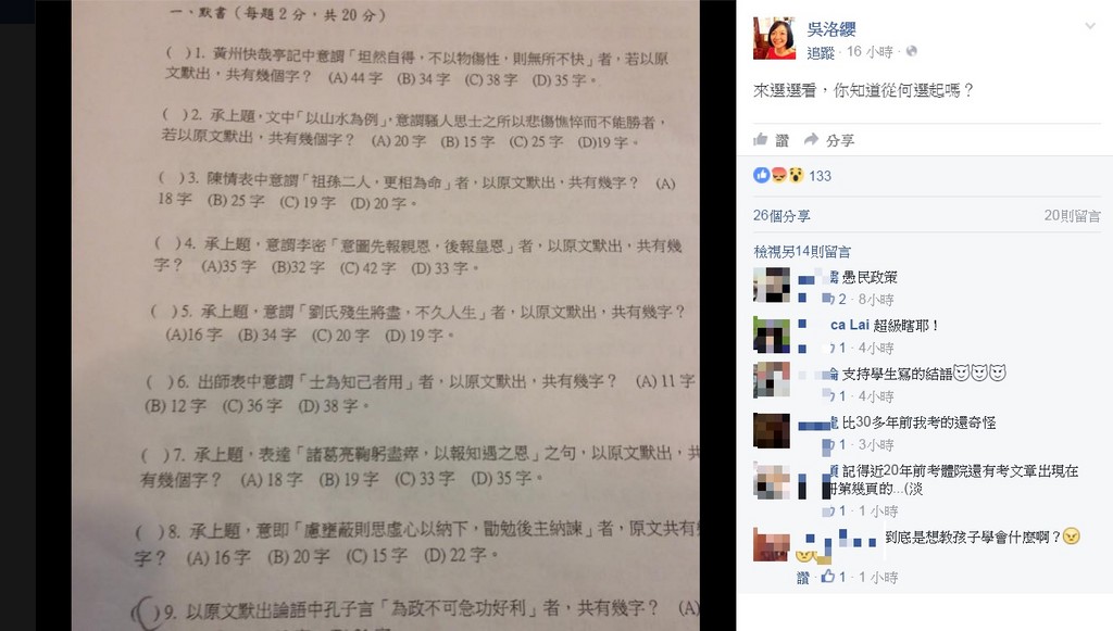 國文考題考得卻像數學一樣?編劇吳洛纓日前在臉書PO出兩張照片,某公立高中高一期末考國文考卷,主要是考「陳情表」「出師表」「黃州快哉亭記」,只不過問的卻全是「以原文默出,共有幾個字?」讓她超傻眼,「算字數是哪招?」甚至還有考生說,「學生對於現狀都會默默接受。」