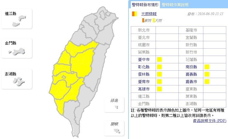 受到午後對流發展旺盛影響,中央氣象局剛剛針對中南部8縣市發布大雨特報,指出今天台中以南至高雄地區有局部大雨發生的機率,請注意雷擊、強陣風及溪水暴漲;低漥地區請慎防淹水。氣象局預計,周五至周日(7月1日至3日),各地山區、中部以北及宜蘭地區午後易有午後雷陣雨。