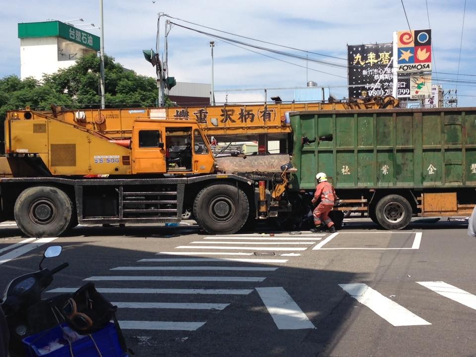 新竹市經國路與公道五路口今天上午10時許驚傳重大車禍,一輛吊車先衝撞正在停等紅綠燈3輛車後,直接撞上最前方一輛大貨車,其中一輛休旅車被夾在2車之間,車體嚴重變形;警消人員獲報後立即到場處理,緊急將休旅車駕駛救出,暫無生命危險,目前已緊急送醫治療,詳細車禍原因仍需等待釐清。