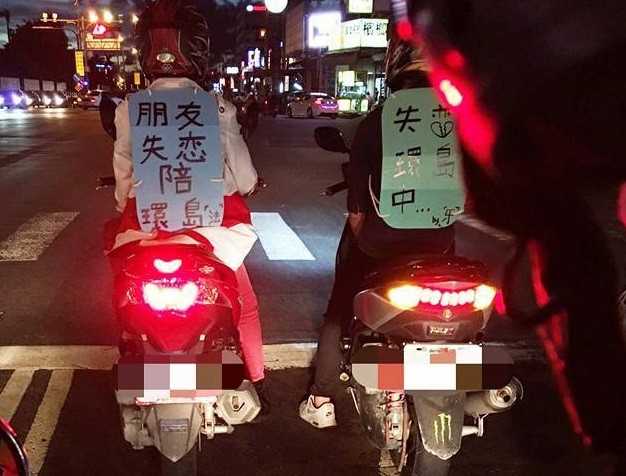 網友在「爆料公社」貼文表示,「覺得燃燒了熱血魂,失戀無罪、友情萬歲,加油囉」。只見前方兩騎士並排等紅燈,右邊的牌子寫道「失戀環島中」,另一個則是「朋友失戀陪環島」。