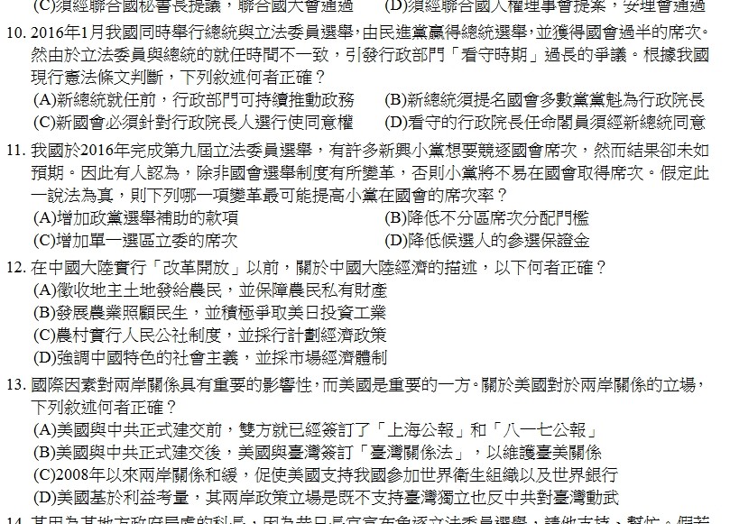 內湖高中公民老師姜淑慎表示,今年測驗時事題多,例如第4題考外籍看護工的權益問題,第9題考聯合國通過決議程序,第30題結合近來國際油價對世界經濟影響,第39、40題則探討最近公路局尚未發燃料催繳通知就罰緩的新聞案例。