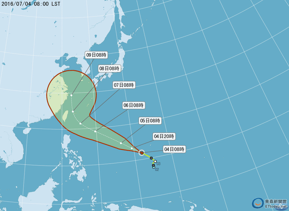 另外,氣象局指出,受到颱風外圍環流影響,7、8日天氣將會有些轉變,台灣附近雲量增多,各地高溫跟前一天相比會略低2至3度;天氣方面,7日北部及東半部地區都將轉為短暫陣雨的天氣型態,而中南部地區還是以午後雷陣雨為主,8日各地都是不定時會有短暫陣雨,尤其北台灣下雨的時間較長、下雨的範圍也會較大。