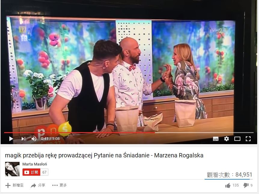 在波蘭晨間直播節目「Question for Breakfast」中,請來了波蘭知名的魔術師馬辛(Marcin Połoniewicz)當嘉賓,與節目主持人馬潔娜(Marzena Rogalska)搭檔表演。原本以為一定會成功的魔術,卻在馬潔娜拍下紙袋子的那瞬間,釘子硬生生的插入了手中,她當場痛到蹲下哀嚎並緊急接受治療。
